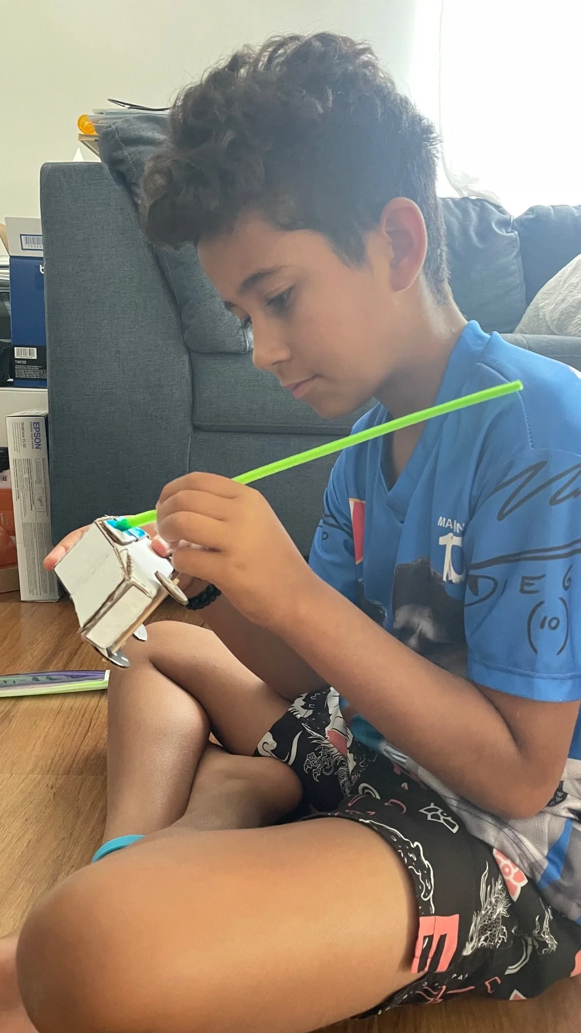 5th Grade HomeschoolToGo Student, working on his project to understand principles of propulsion and motion.